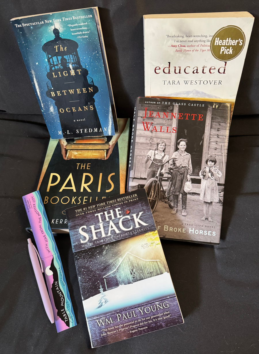 The morning book club has created a few bags of gently used and much-loved books. This bag has five books encompassing a good variety of great stories, as well as a magnetic bookmark from South Africa and a reader’s pen.