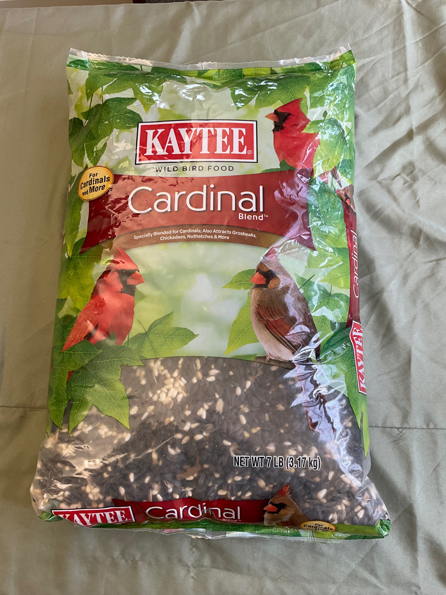 An unopened 7 lb bag of Kaytee’s cardinal blend of wild bird food. It is made to attract cardinals, grosbeaks, chickadees, nuthatches, and more.