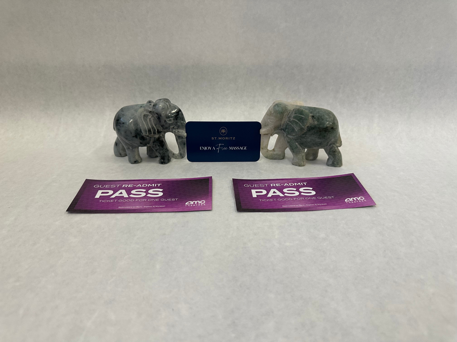 Introducing the Balance Bundle, an exclusive package designed to enhance your well-being and entertainment experience. This incredible bundle includes a rejuvenating free massage, allowing you to unwind and de-stress. Additionally, you'll receive two beautifully crafted Elephant stones, perfect for bringing tranquility and harmony into your space. To top it all off, enjoy two AMC movie tickets, giving you the chance to catch the latest blockbuster on the big screen. Don't miss out on this perfect blend of relaxation and enjoyment with the Balance Bundle!
