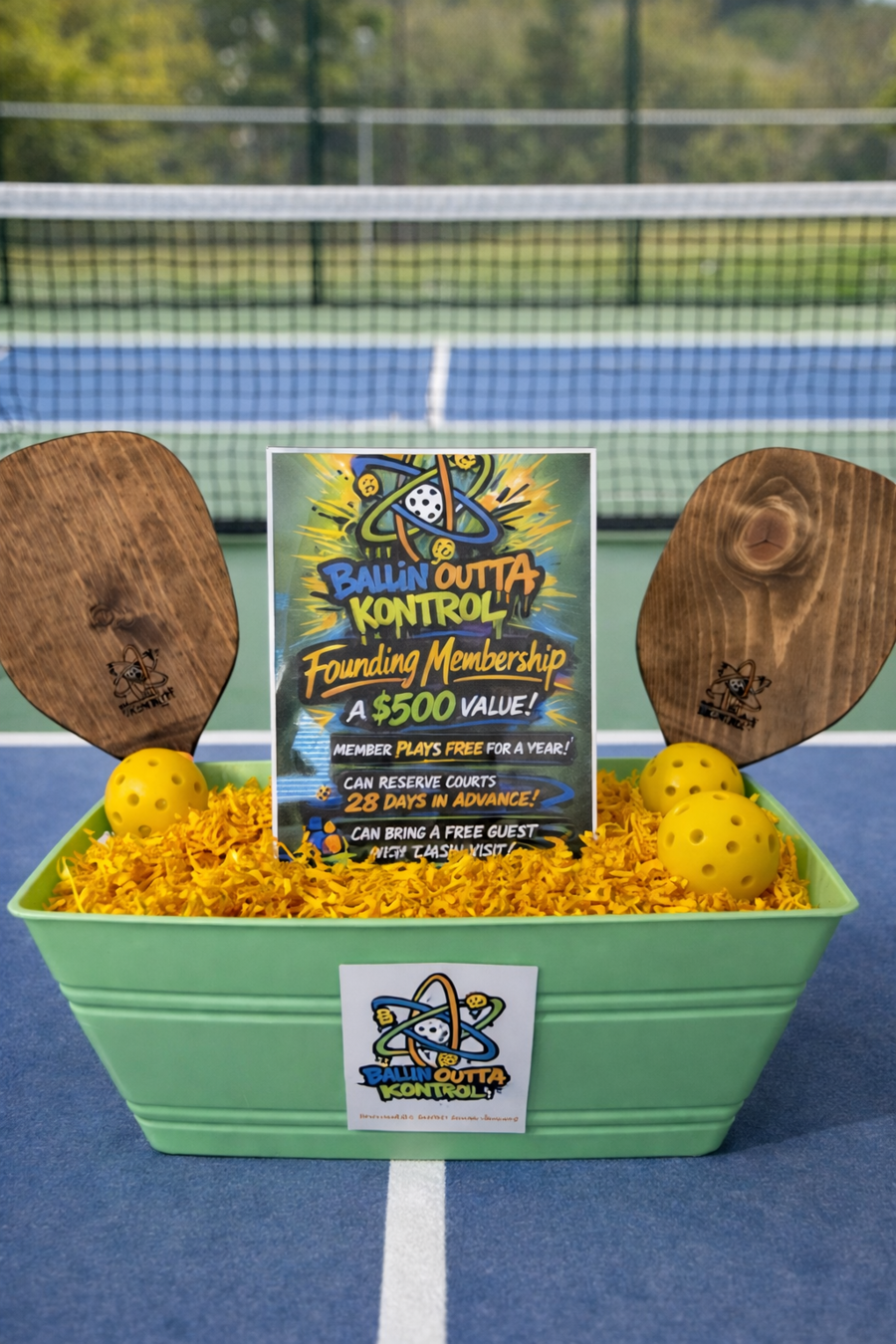 Serve up some serious fun with this exclusive Ballin’ Outta Kontrol Pickleball Basket! Perfect for beginners and seasoned players alike, this package is designed to elevate your pickleball experience on and off the court.
