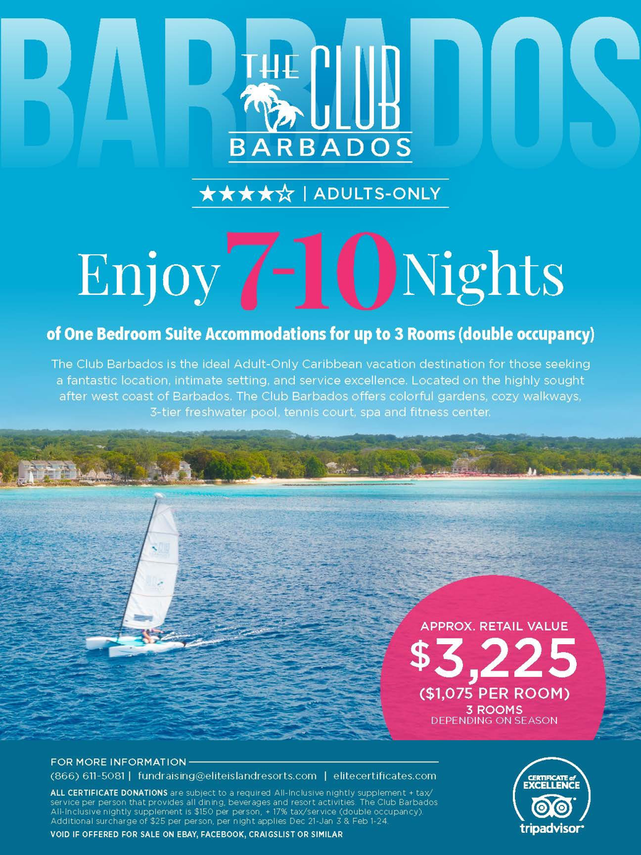 The Club Barbados is the ideal Adult-Only Caribbean vacation destination for those seeking a fantastic location, intimate setting, and service excellence. Located on the highly sought after west coast of Barbados. The Club Barbados offers colorful gardens, cozy walkways, 3-tier freshwater pool, tennis court, spa and fitness center. APPROX. RETAIL VALUE $3,225 ($1,075 PER ROOM) 3 ROOMS DEPENDING ON SEASON ALL CERTIFICATE DONATIONS are subject to a required All-Inclusive nightly supplement + tax/ service per person that provides all dining, beverages and resort activities. Pineapple Beach Club All-Inclusive nightly supplement is $150 per person, + 17% tax/service (double occupancy). Additional surcharge of $25 per person, per night applies Dec 21-Jan 3 & Feb 1-24.