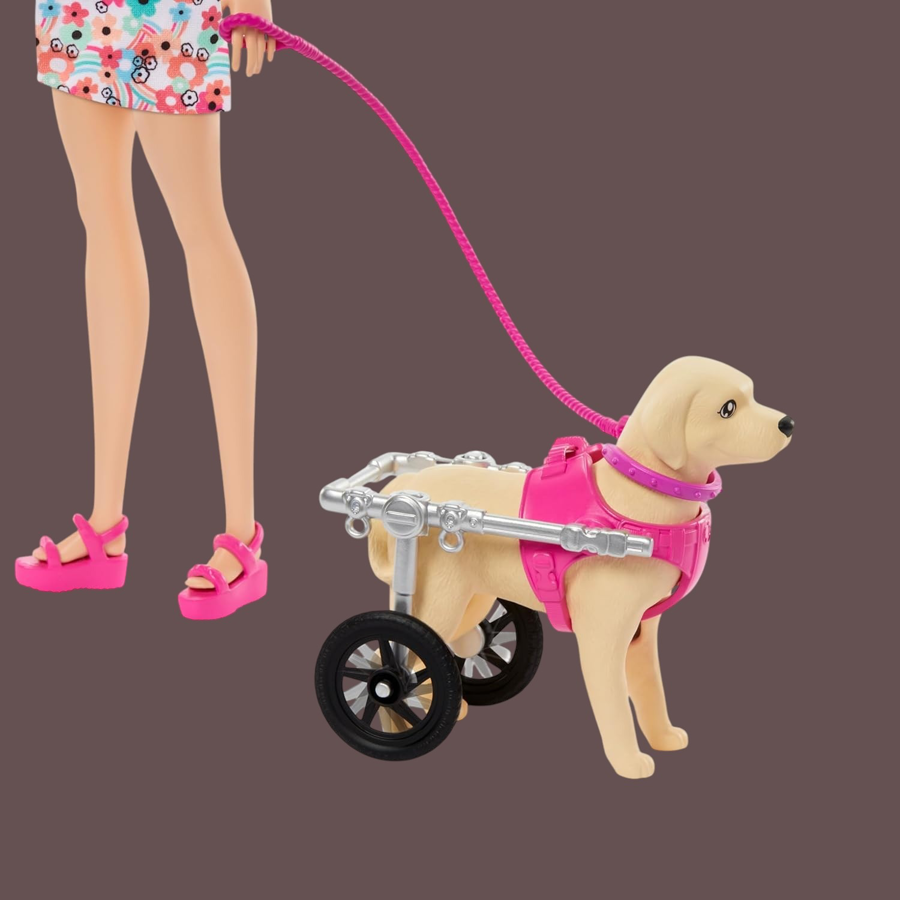 This playset includes a puppy and a large dog with a supportive wheelchair with working wheels. The two best friends love to walk the Barbie doll. Children can remove the wheelchair and reattach it to the puppy who just needs a little more love and care. With accessories such as a feeding bowl, collars, a pet bed and a leash that can be held by the doll, the Barbie doll has everything she needs to take care of her animal friends. Great gift for children who have a love for animals, especially dogs!