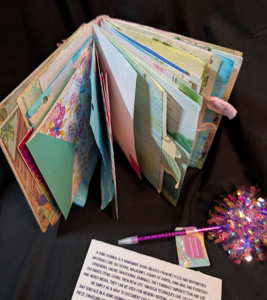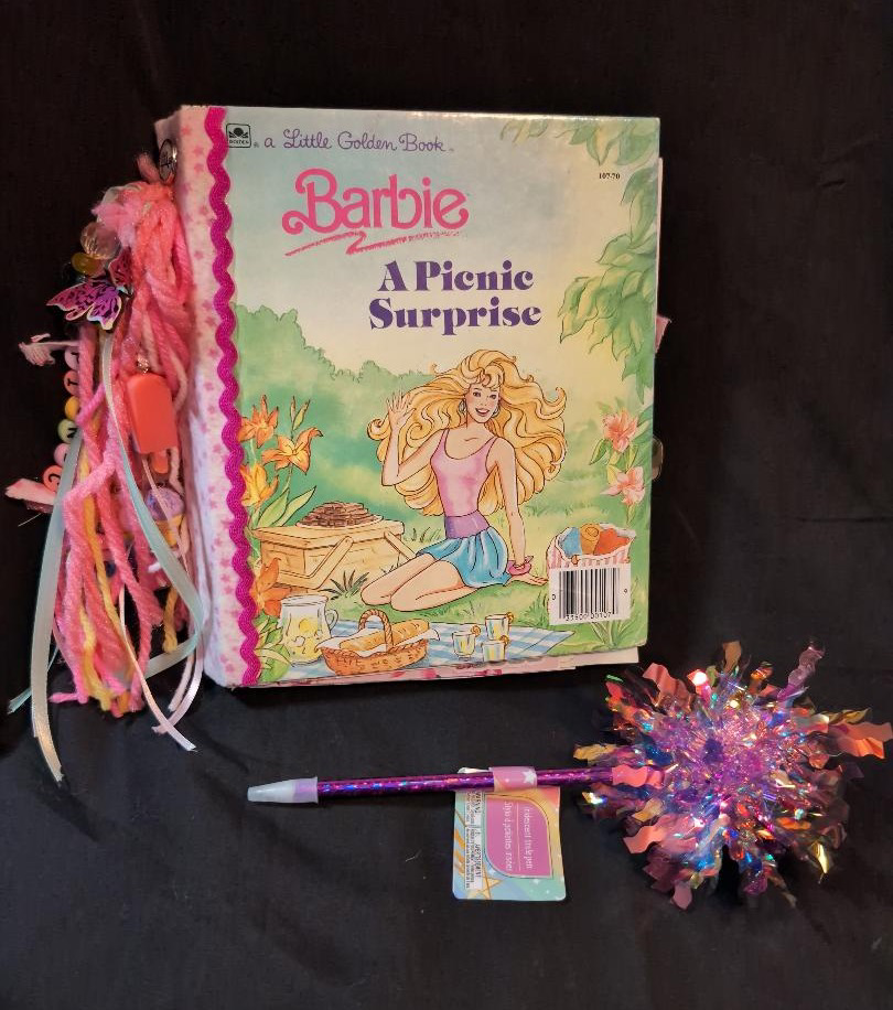 A junk journal is a handmade book created from recycled and repurposed materials like old books, magazines, scraps of paper, & junk mail. They embrace imperfection and use discarded items giving new life through techniques like collage & writing.Can be used for memory keeping and a way to be creative through self expression. A lot of time and creativity went into the making of this junk journal. Some special girl will cherish this for eternity! This is a priceless item! Includes Junk Journal and Cute Pen!