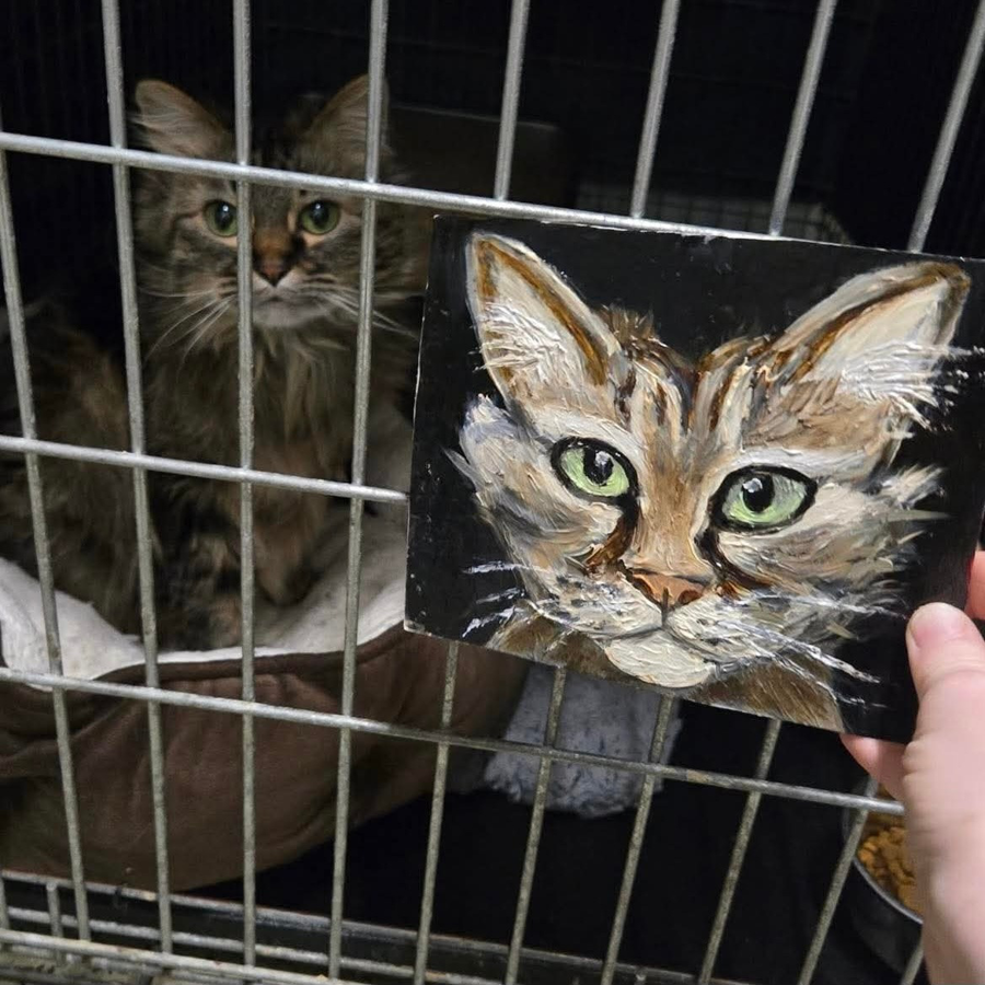 This incredibly special piece features Barbie, one of our adoptable special needs cats, captured in a heartfelt hand-painted portrait by our longtime volunteer Angelina.