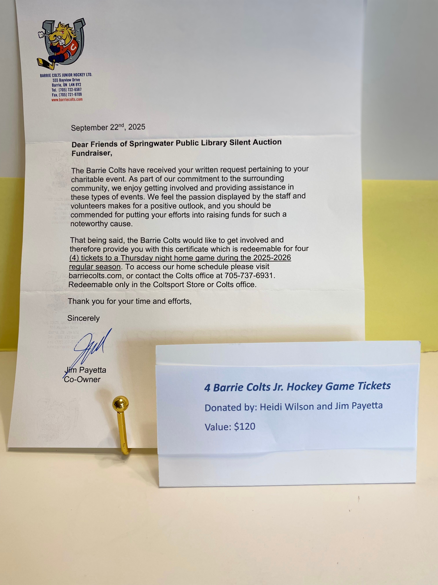 Barrie Colts 4X PassesItem Number: 13Category: SportsRetail Value: CAD $120.00 Bidding Price: CAD $66.00 Highest Bidder: gdg71 8 Bids Bid Enter CAD $72.00 or more Auto Bid Minimum Bid Increment: CAD $6Time Left 9 Days : 19 Hours : 04 Minutes : 35 SecondsEnds: Mon, Jan 01, 0001 12:00 AM Donated By: Barrie Colts