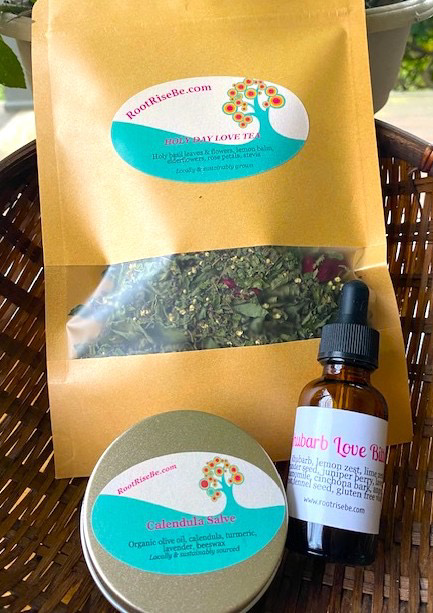 The basket contains salve, a bottle of digestive bitters and herb tea.
