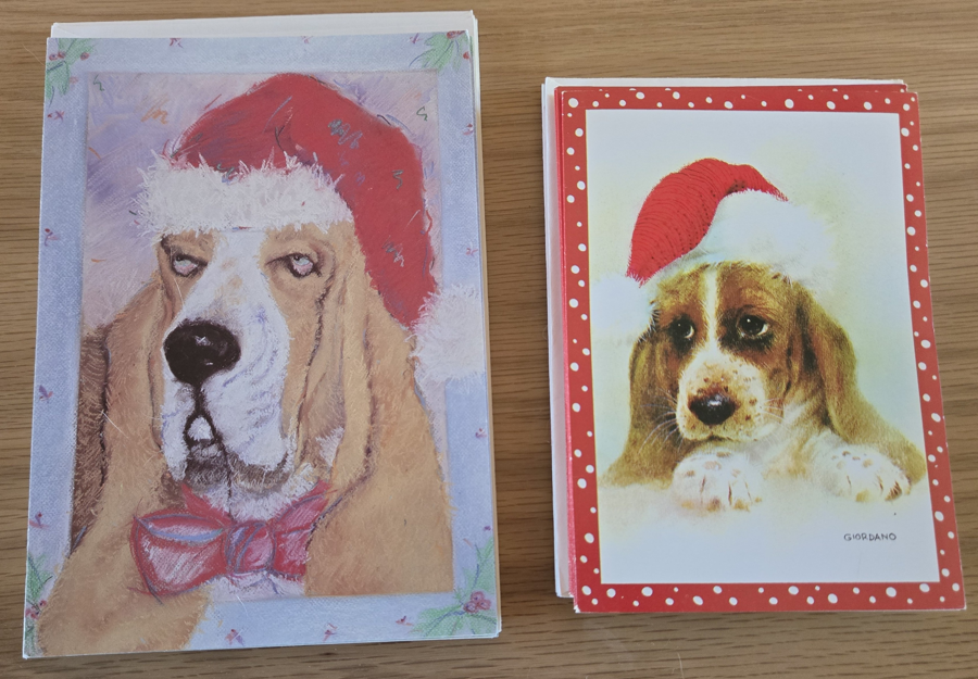 10 smaller cards and 8 larger cards with envelopes. Inside greeting Merry Christmas greeting.