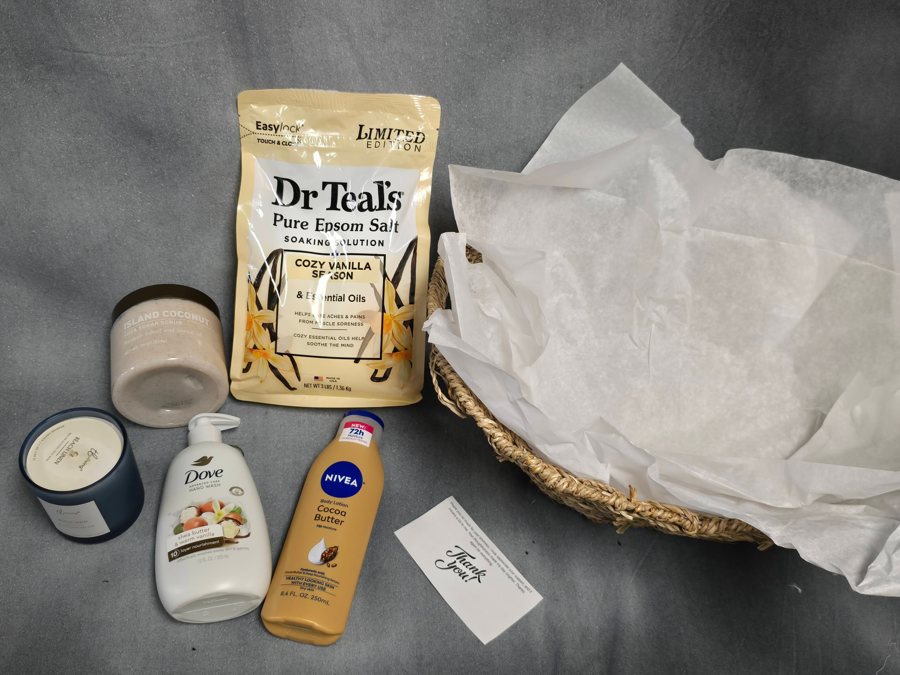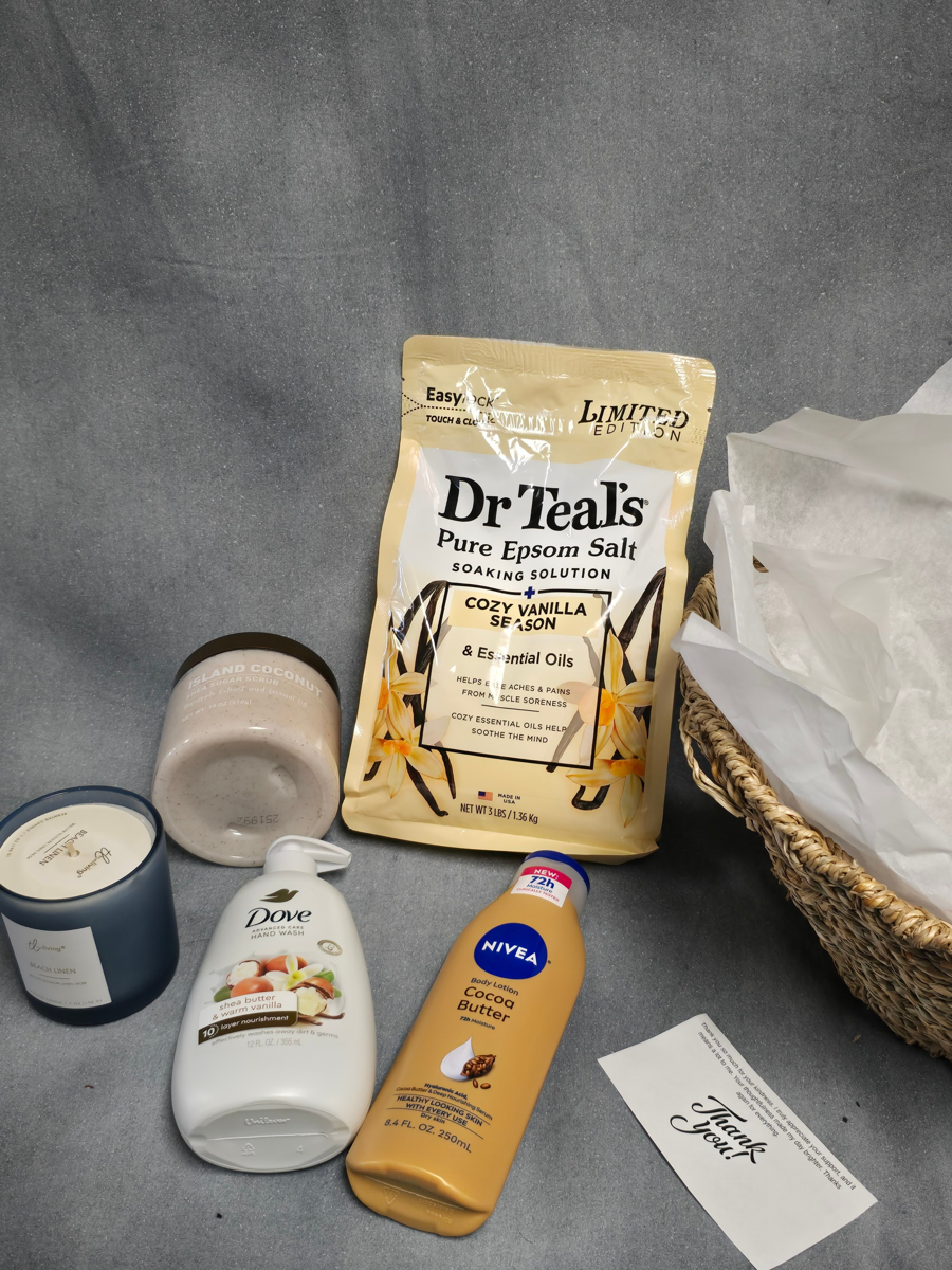 Soak in and relax with the sweet smell of the beach nearby. Inside the basket: *Dove Hand Soap *Beach Linen Candle *Coconut Sugar Scrub *Dr. teals Vanilla Epsom salt *Nivea Cocoa butter lotion Basket Artist: Delilah Reakoff