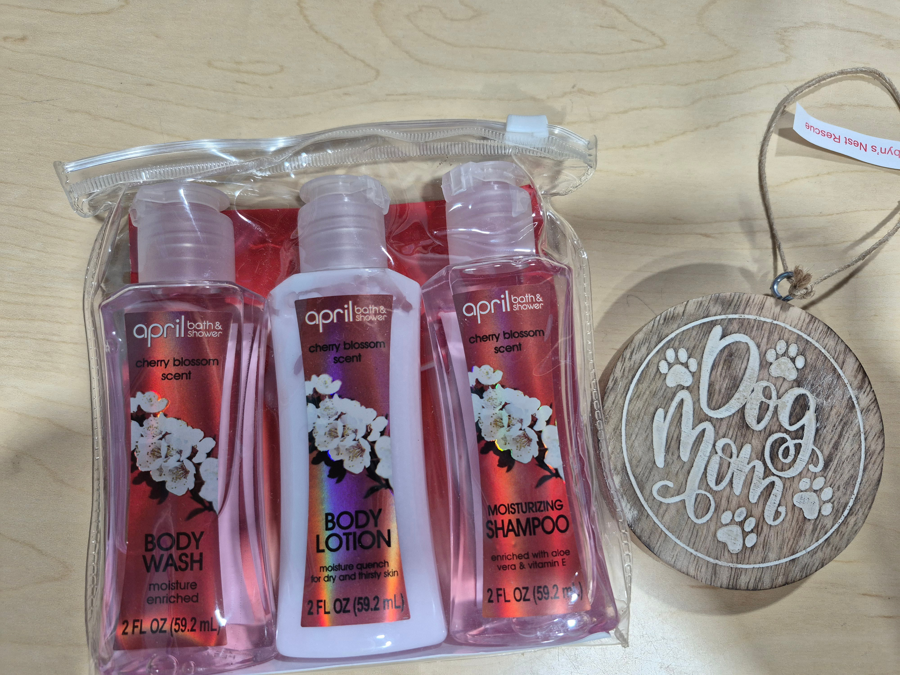 April bath & body set and 'Dog Mom' wall hanging.