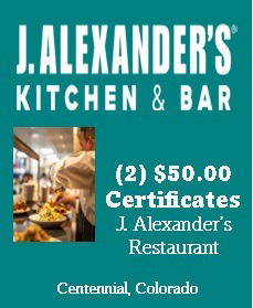 #1017 - (2) $50 Gift Certificates to J. Alexander's Kitchen & Bar (9709 E. County Line Rd, Centennial). Where classic American fare meets Colorado charm. Conveniently located on E-470 near Centennial Mall North and Park Meadows Mall. Not redeemable for cash.