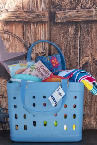 Contains Tupelo Tote, Picnic kit, beach tablecloth, beach towel, swim tube with handles, sand bucket, and “People We Meet on Vacation” book.