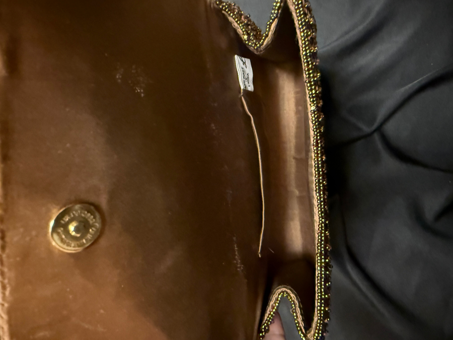 Vintage style rare bronze rhinestone clutch with gold beaded floral design.