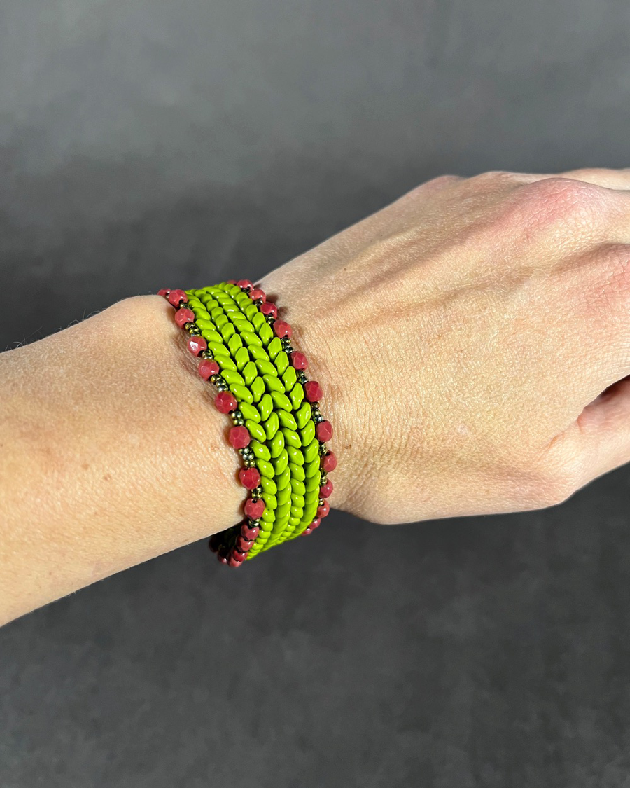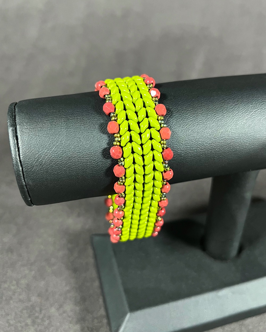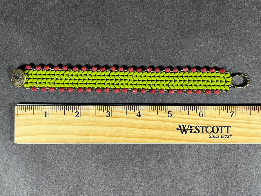 A beautiful pop of color combined texture reminiscent of dragon scale makes this piece and point of interest. Great for everyday wear and a splash of fun! Made with super duos, Czech Firepolish, seed beads, and a brass button closure. Measures 7" long.