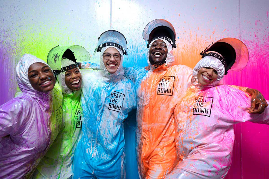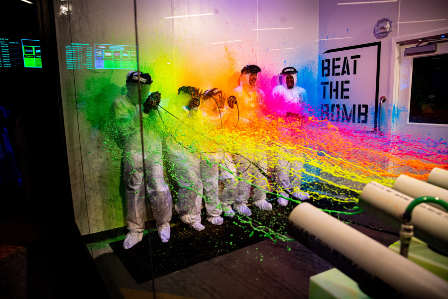In the Paint, Foam, or Slime Mission Experience, your team of 4-6 players will gear up in hazmat suits and advance through 5 hi-tech video game rooms, including a Laser Maze, to earn time on the bomb clock. You'll use that time in the 5th and final room to disarm a Paint, Foam, or Slime Bomb, or else... GET BLASTED!