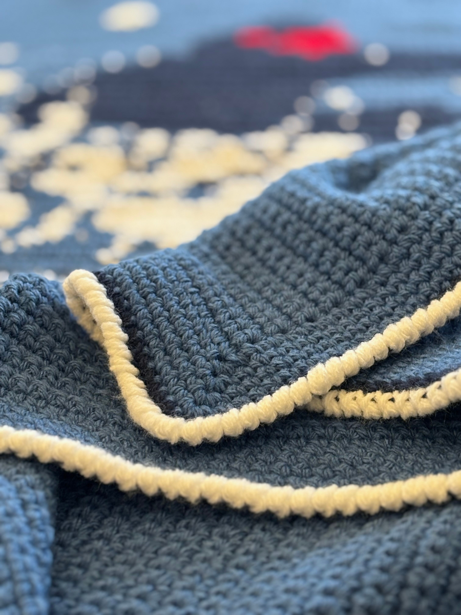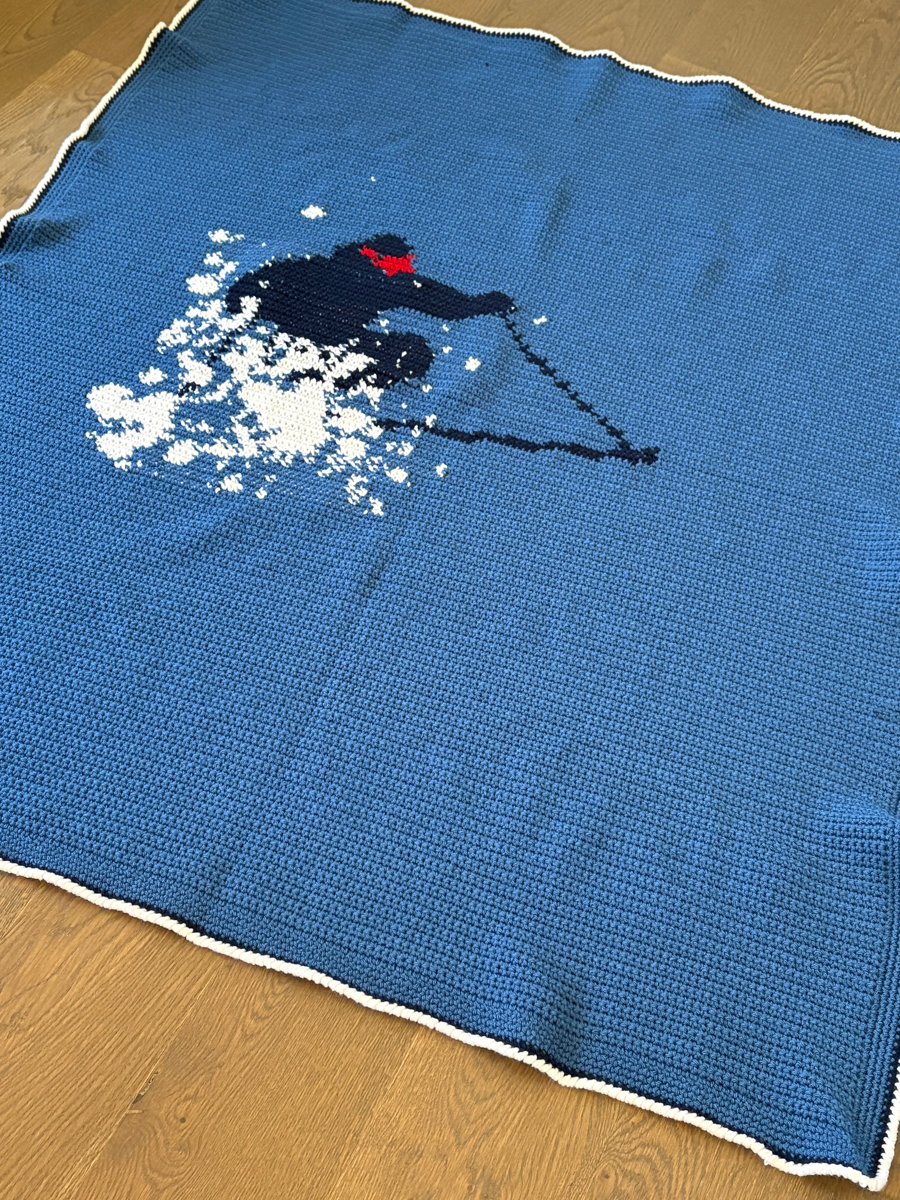 Are you an avid skier or love unique finishing touches for your ski chalet or cabin? This is the auction item for you! Hand crocheted afghan featuring a skier tearing up the slopes! Blanket measures 47 inches wide and 60 inches long, perfect for cuddling under after a long day on the slopes!