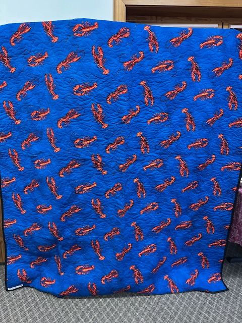 This stunning work of art was handmade by Holly Patterson. The front features quintessential Maine scenes including moose, lobsters, lighthouses, and loons, with buoys and starfish making up the borders. The back of the quilt is a vibrant blue with red lobsters. This is a collectors item that will be cherished and handed down through the generations. Size is 72.5 inches x 88.5 inches.