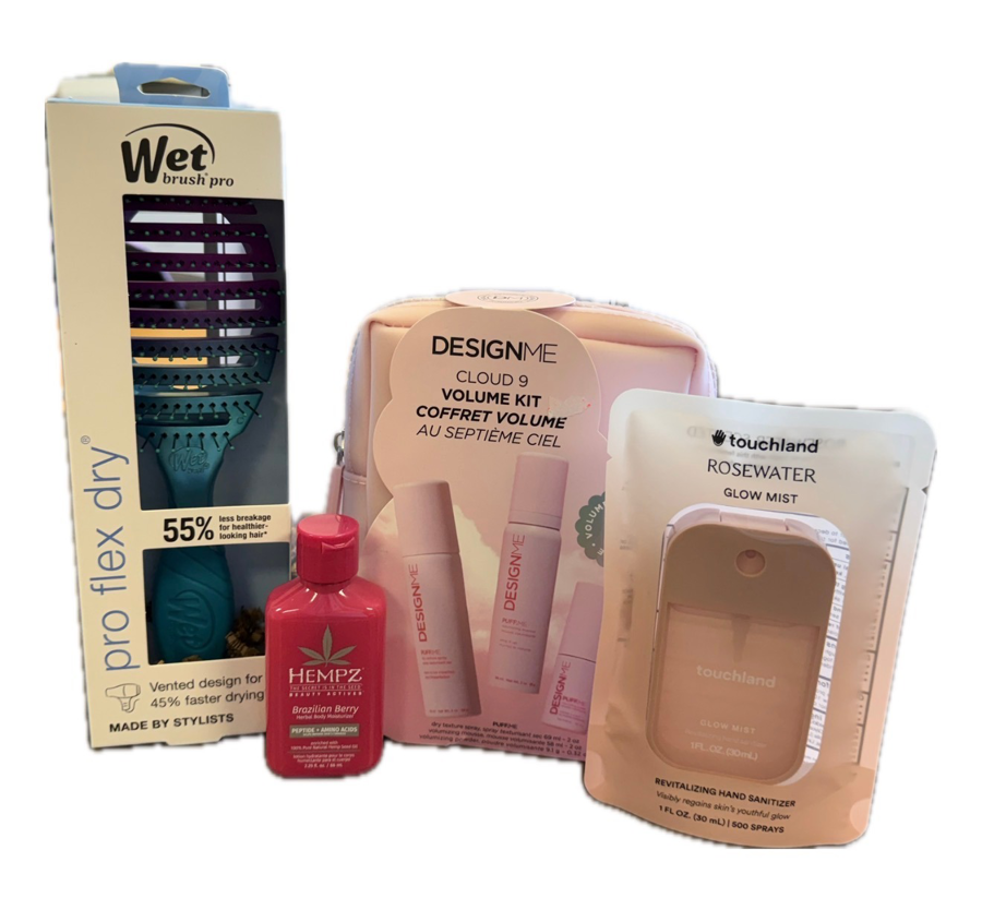 Wet Brush, Cloud Nine Hair Products, Hand Sanitizer, Lotion.