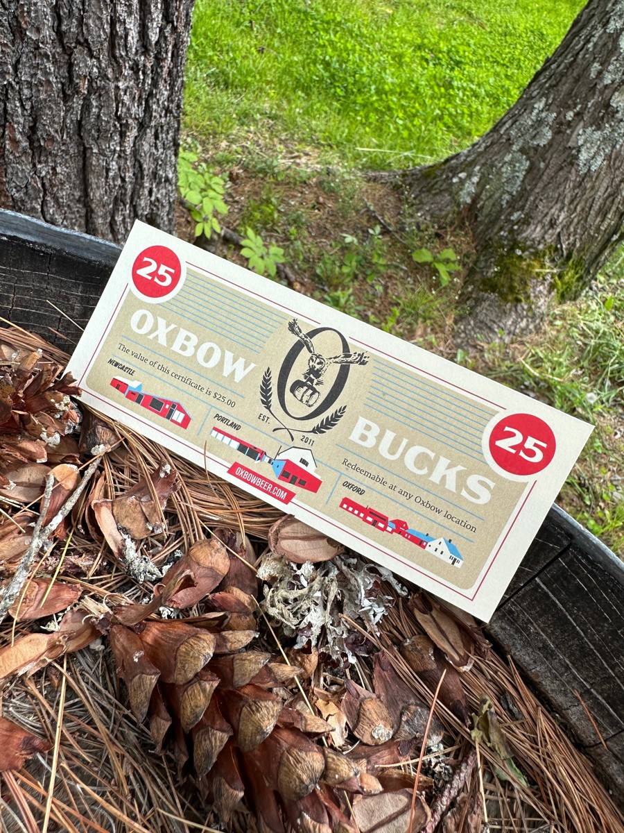 $25 Beer Bucks certificate from Oxbow Brewery, redeemable at any location: Newcastle, Portland or Oxford.