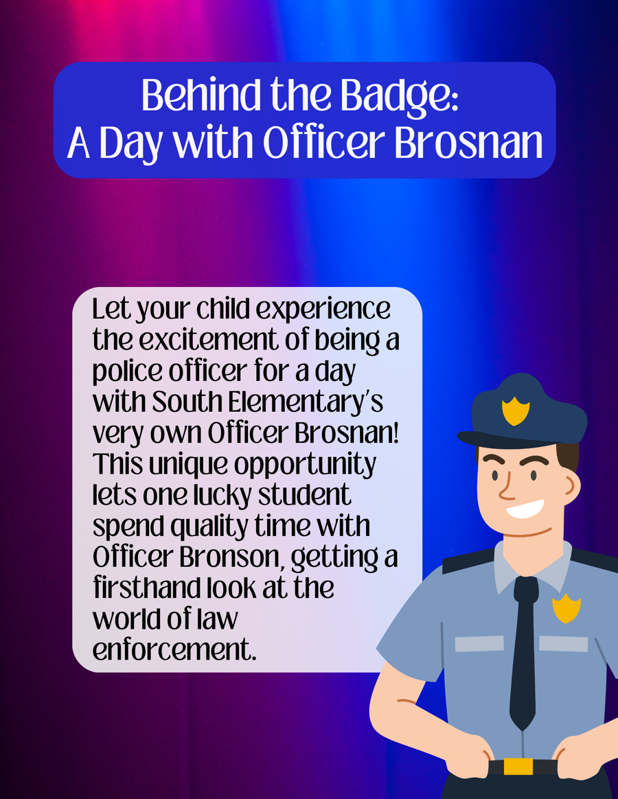 Let your child experience the excitement of being a police officer for a day with South Elementary’s very own Officer Brosnan! This unique opportunity lets one lucky student spend quality time with Officer Bronson, getting a firsthand look at the world of law enforcement.