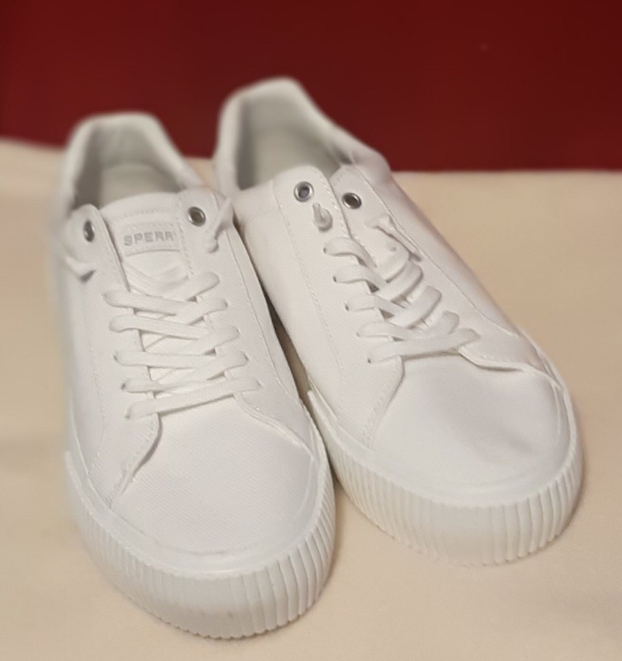 Introducing the Sperry Bermuda SeaCycled™ Canvas Sneaker in White, Women's Size 8. This stylish sneaker comes new in box and features the innovative Signature Wave-Siping™ technology outsole, designed for ultimate stability and traction on various surfaces. Experience unparalleled comfort with the SeaCycled™ Bermuda Lace-to-Toe Chambray memory foam footbed, which provides cushioned support for all-day wear. Perfect for both casual outings and active days, these sneakers combine fashion and functionality seamlessly. Don't miss the chance to own this essential addition to your footwear collection!