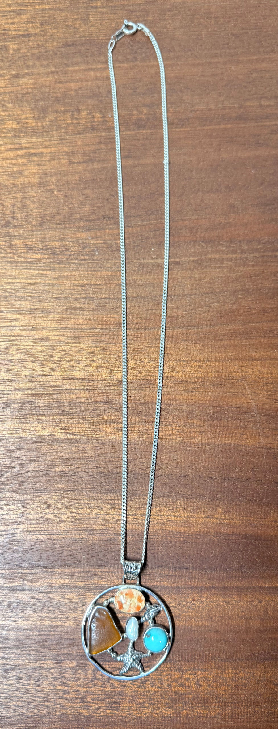 What says “Bermuda Day” more than this locally crafted pendant? This piece is a sterling silver sea-themed medallion pendant featuring a collage of natural elements and gemstones. The circular open-frame design includes a detailed starfish, seashells, and several distinct stones. Such a gem!