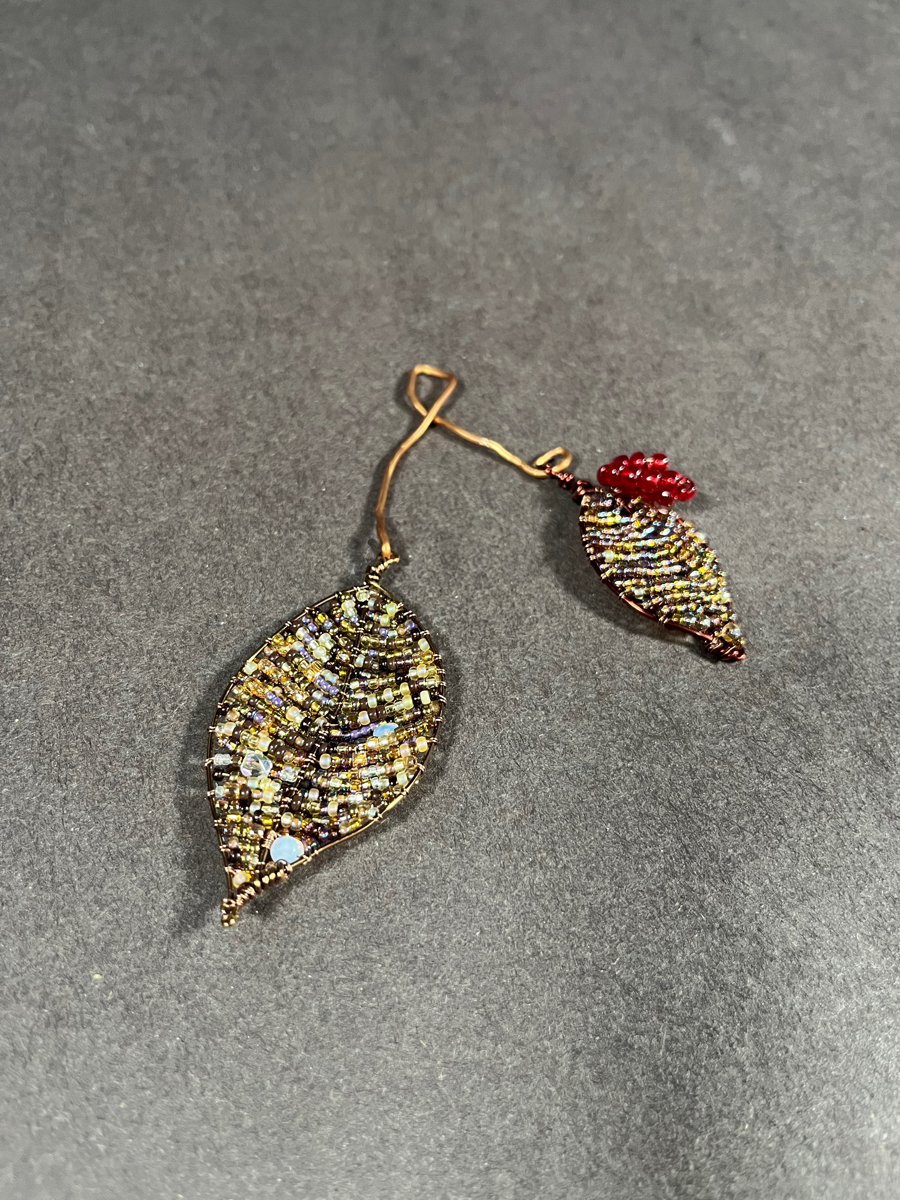 These two golden beaded leaves are accompanied by a beaded red berry, an absolutely lovely arrangement!