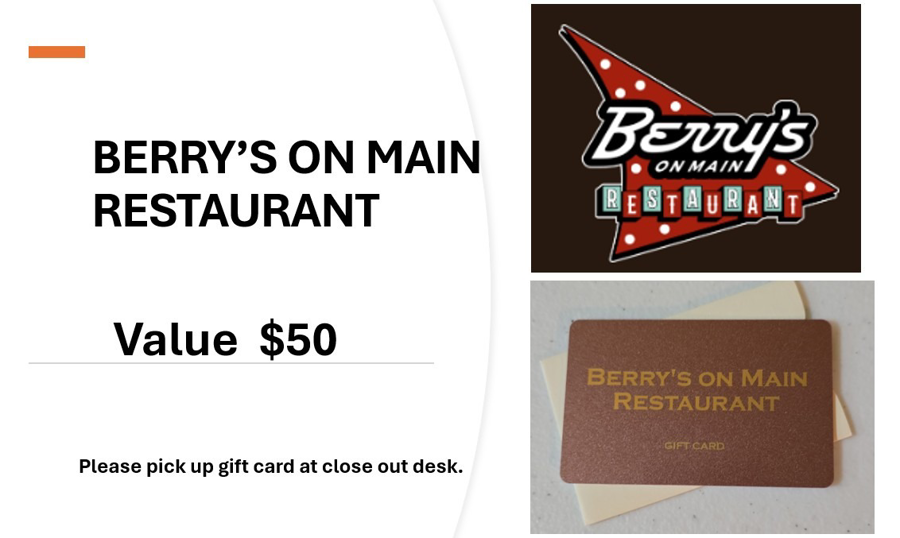 Experience the charm of Berry's on Main Restaurant with this gift card, perfect for enjoying a meal in a historical casual setting. Located in the heart of historical downtown Norwalk, Berry's on Main offers a nostalgic atmosphere that transports you back in time. Indulge in a menu filled with American staples that are sure to satisfy your cravings. Whether you're looking for a cozy dinner or a delightful lunch, this gift card is your ticket to a memorable dining experience. Please pick up gift card at check out desk!