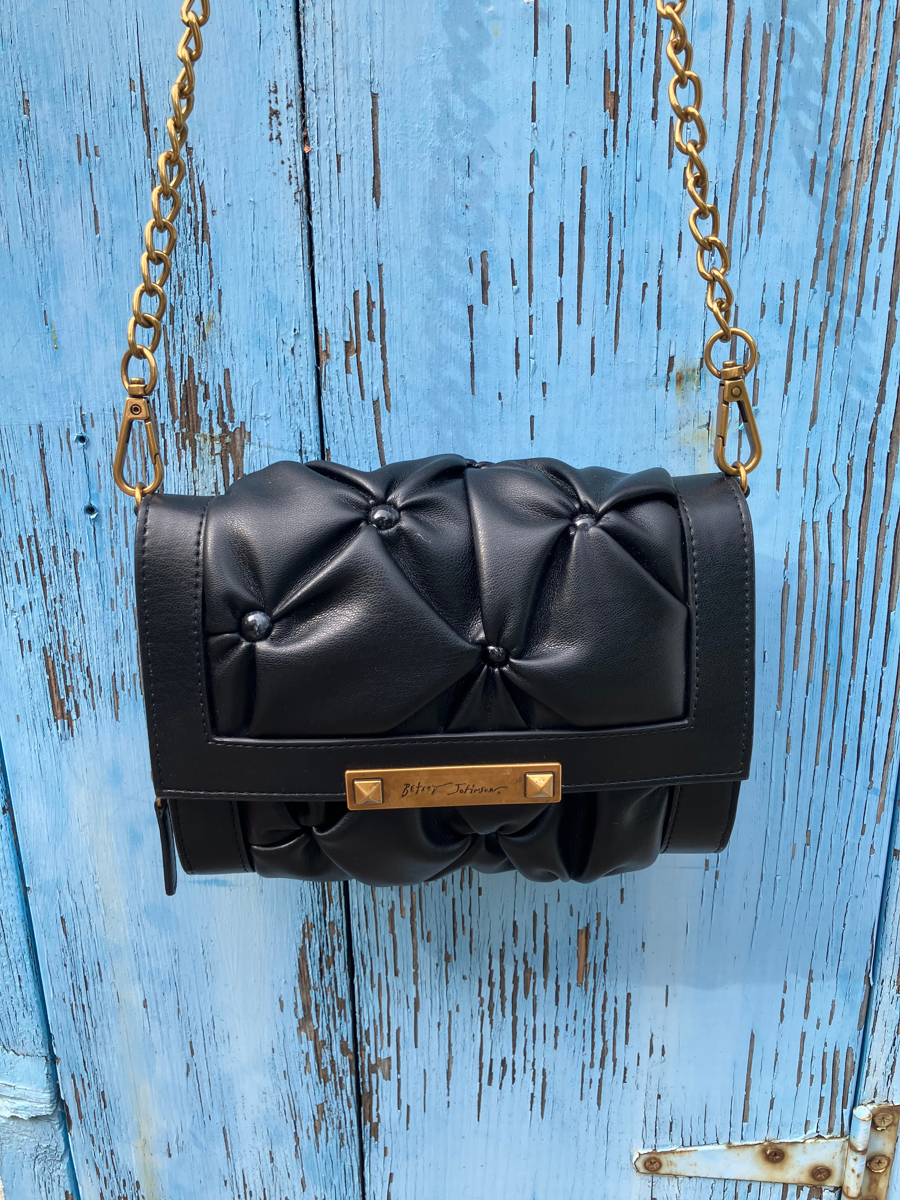 Reinvent and elevate your Style with this classy Betsey Johnson handbag in chic black, one of a kind Betsy Johnson flair. With long chain strap and over the top flap and two compartments on the inside.