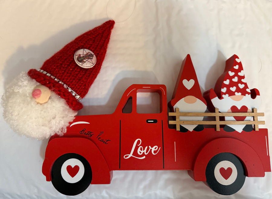 One of the last hand-knitted gnomes by Betty Peart! There is also a wooden ornament truck with gnomes, signed by Betty! These are famous world-wide and when she became unable to knit anymore, they are now priceless! Perfect for the Christmas tree or your office, or memorabilia shelf!