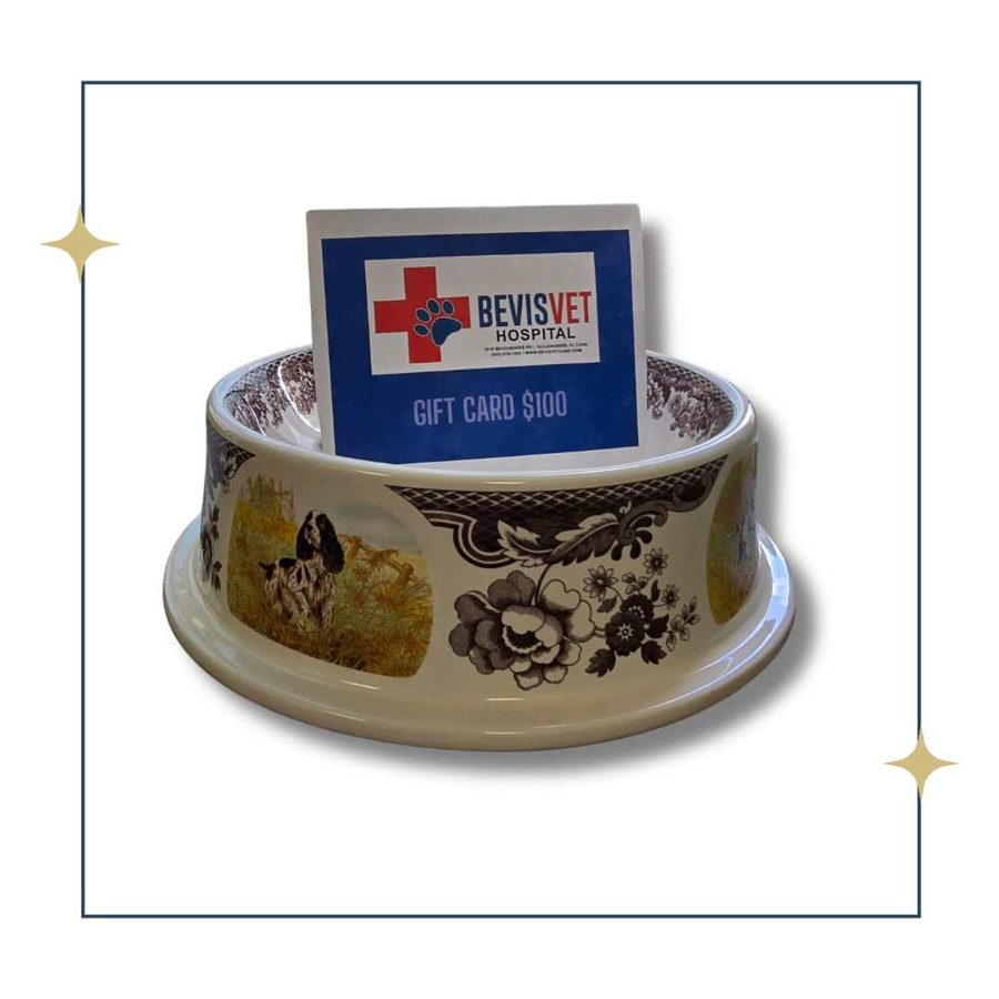 This sweet package includes a $100 gift certificate to Bevis Veterinary Clinic — a trusted name in compassionate pet care — along with a beautiful Spode Woodland Dog Bowl.