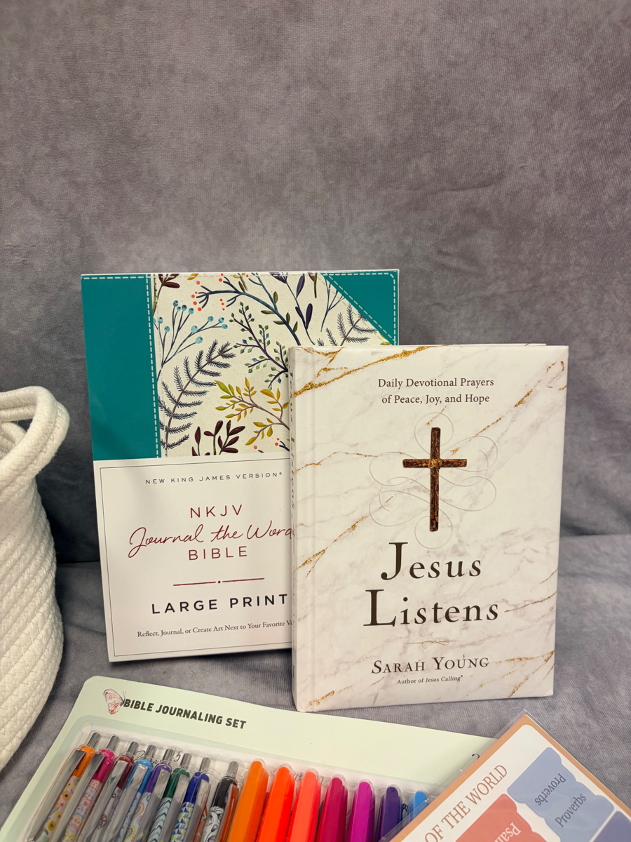 Basket, blanket, bracelet, pens/highlighter set, Large Print NKJV Bible, Daily Devotional, Bible Tabs/post its, and Brave Bag.