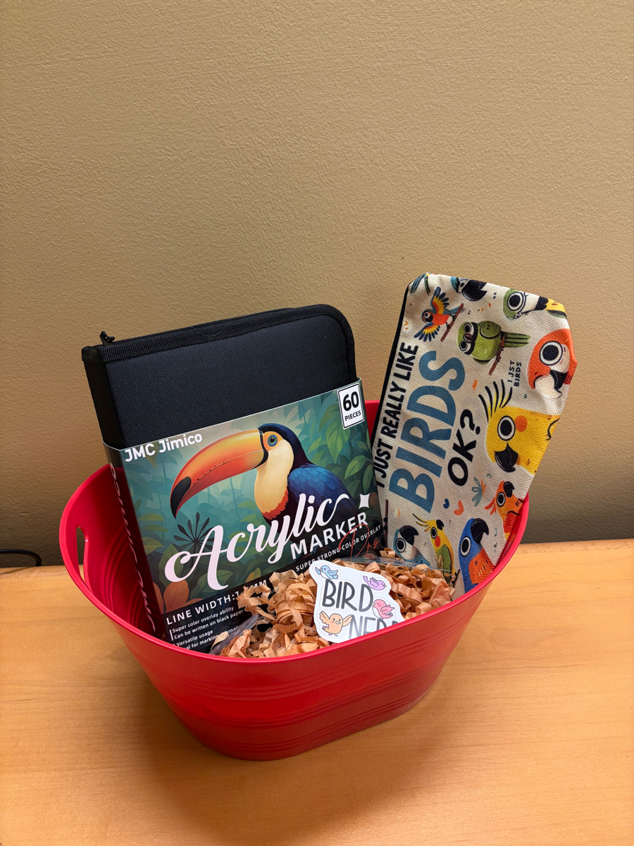 A fun collection for any bird enthusiast, including an acrylic marker set, stickers, and a bird-themed pencil pouch.