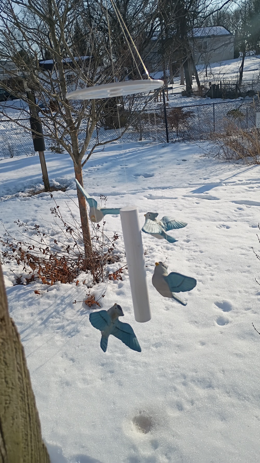 This item has a central chime with 4 birds (which I think most likely resemble Blue Jays) circling it. Creates a nice tone in the breeze or use for indoor decor.