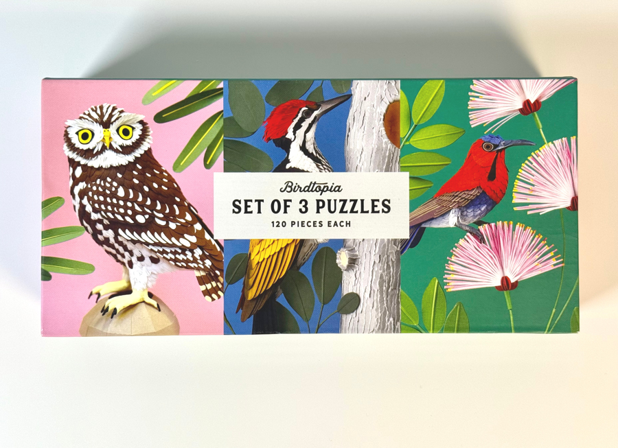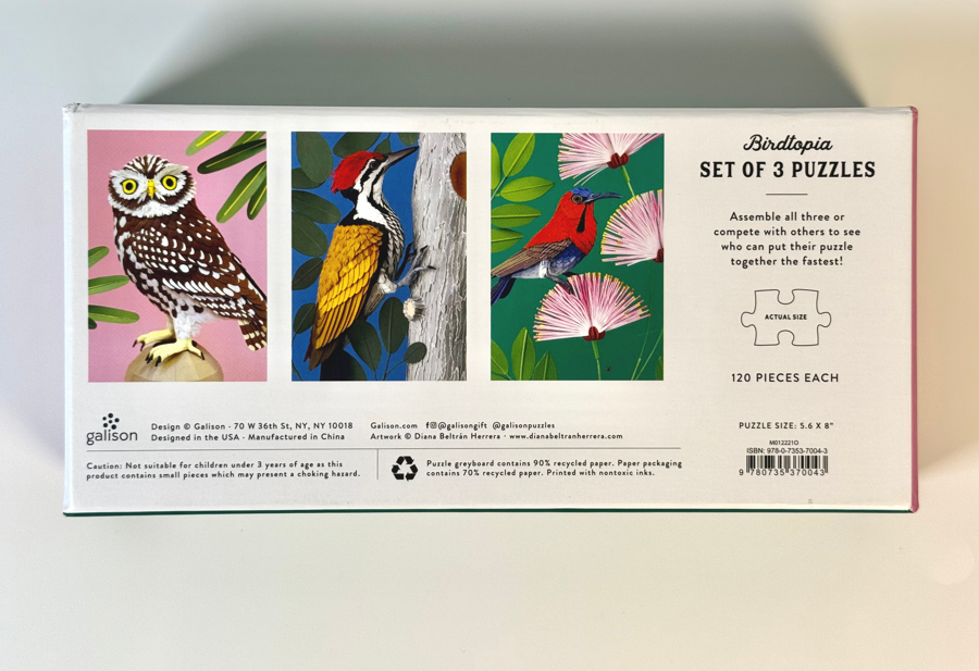 Three 120-piece puzzles, each featuring an individual bird. Complete all three or compete with others. Finished size 5.6 x 8 inches. From Galison Puzzles.