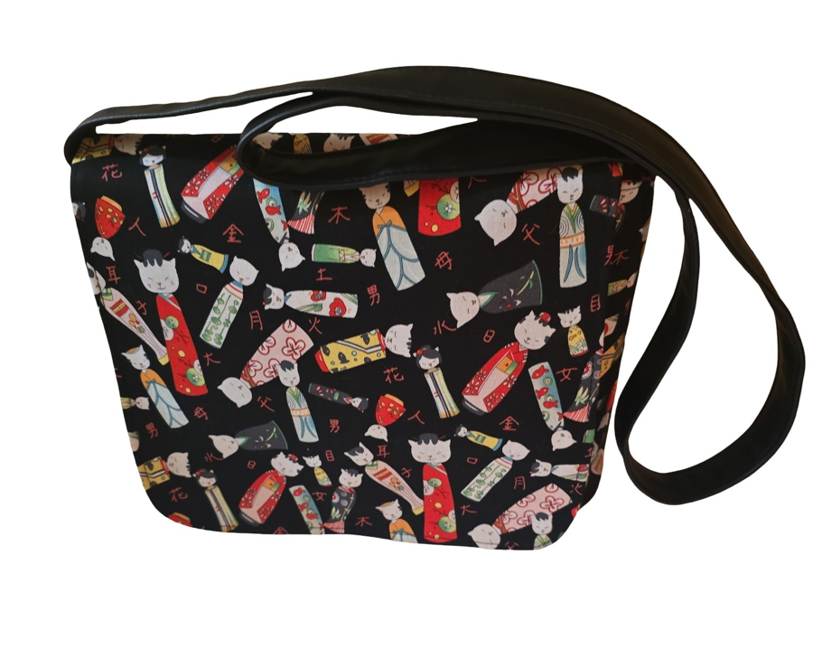🖤 Black Kokeshi Cat Dolls Fabric Purse – Handmade in the U.S.A. Add a touch of charm and artistry to your collection with this unique handmade crossbody purse, crafted from Alexander Henry’s whimsical “Kokeshi Cat Dolls” fabric. Features: ✨ Handmade in the U.S.A. with care and quality craftsmanship 🎎 Alexander Henry “Kokeshi Cat Dolls” fabric – eye-catching and collectible 💼 Crossbody design for comfort and convenience 📏 Dimensions: 10” H × 11” L × 3” W 💋 Front flap closure with secure fit ❤️ Rich red silk lining for a luxurious touch 🔒 Interior zip pocket to keep valuables safe 📱 Exterior pocket for quick access to essentials 🖤 Black leather strap (23”) adds durability and style This purse blends art, function, and fashion—perfect for everyday wear or as a standout statement piece.