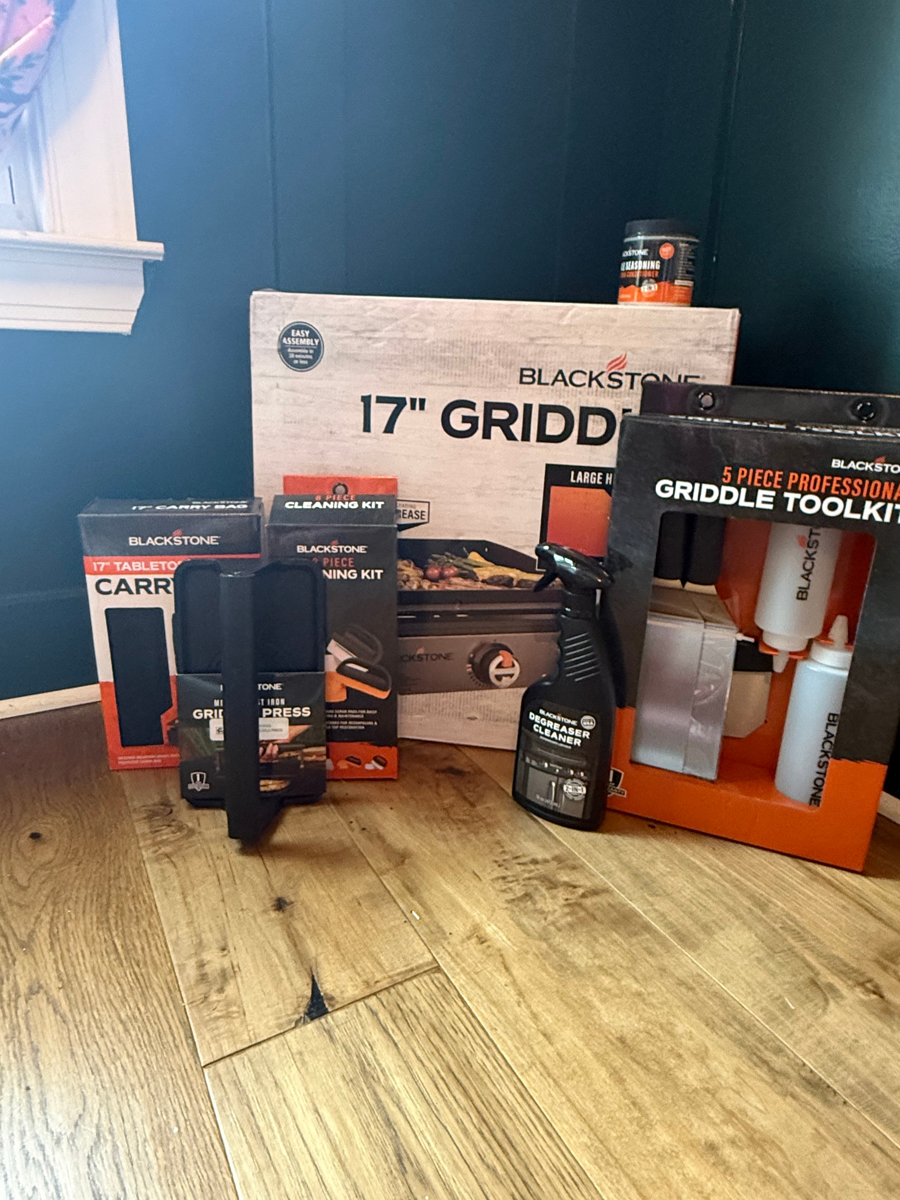 Blackstone 17 inch Griddle with Carry Bag, Cleaning Spray, Seasoning Salt, Griddle Press, Cleaning Kit and Toolkit