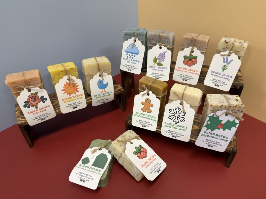 Blind Dave's Soaps: made with love by the gnarled hands of Blind Dave. He makes soap the way your great-grandmother did: with lye. You and your family will appreciate having a stockpile of this excellent soap. Scent varieties include: gingerbread, cranberry, lavender, sunshine, green tea & cucumber, peppermint, rose, lilac, oatmeal, cranberry & vanilla, jack frost, and rain.