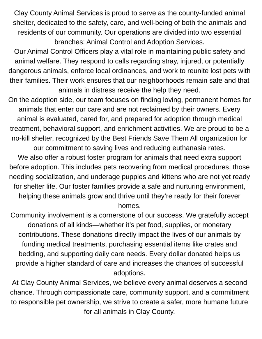 Description: Elevate your next celebration with this $50 gift certificate toward custom balloon décor from Blissful Balloons by V—perfect for birthdays, milestones, or simply adding a festive touch! Expires 12/01/2026. About Clay County Animal Services: Clay County Animal Services cares for animals in need and works tirelessly to ensure they live happy, healthy lives. Your support helps them continue this vital work.