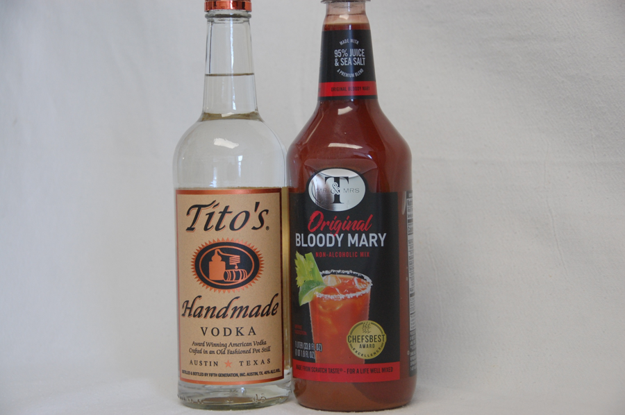 Bottle of Tito's Handmade Vodka and Mr & Mrs T's Original Bloody Mary mix.