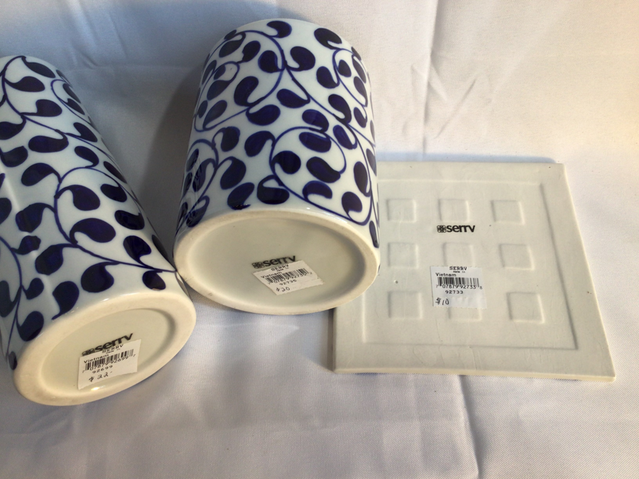 SERRV - three piece set with vase, utensil holder and tile/trivet. World Nonprofit - Three pieces in new, unused condition- perfect for holiday gift! Tile - 6.125 Utensil holder - 4.125 x 5.25” Vase - 3.5” x 8”