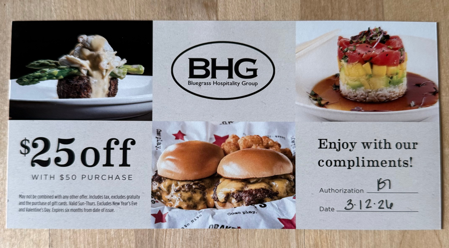 $25 off of $50 at any Bluegrass Hospitality Group Restaurant; Malone’s, Aqua, Drake’s, Harry’s, OBC Kitchen, Malone’s Prime, is valid at any location
