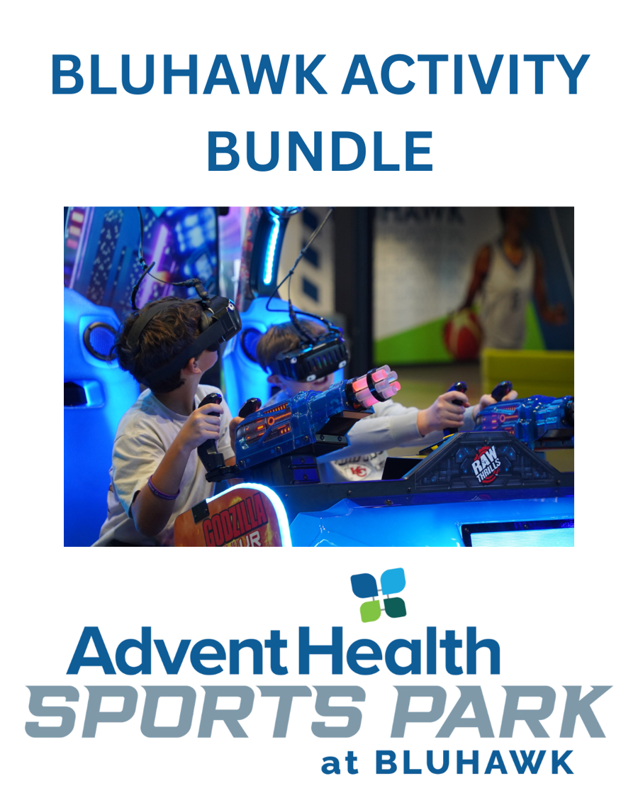 The high-energy `Ultimate Adventure` package at AdventHealth Sports Park at BluHawk offers a full day of entertainment fora group of four. Whether you`re looking for a family outing or a competitive night with friends, this bundle covers the best of the district`s newest attractions. Includes: 25 game cards for the use at Hawk`s Outpost, 1 bowling lane rental (includes shoe rental), 1 Krazy darts bay, 4 ice skate passes (includes skate rental)