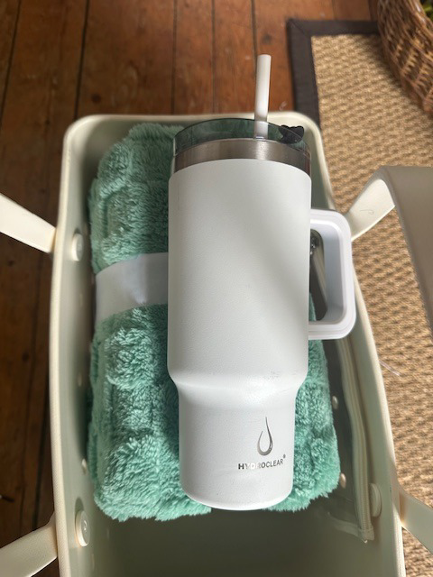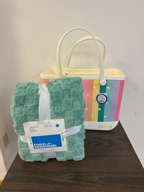 This colorful and very popular BOGG bag is perfect for the beach, for a picnic, on the boat, watching sports, or heading up to camp! It includes a beautiful plush green blanket and a white Hydroclear travel mug.