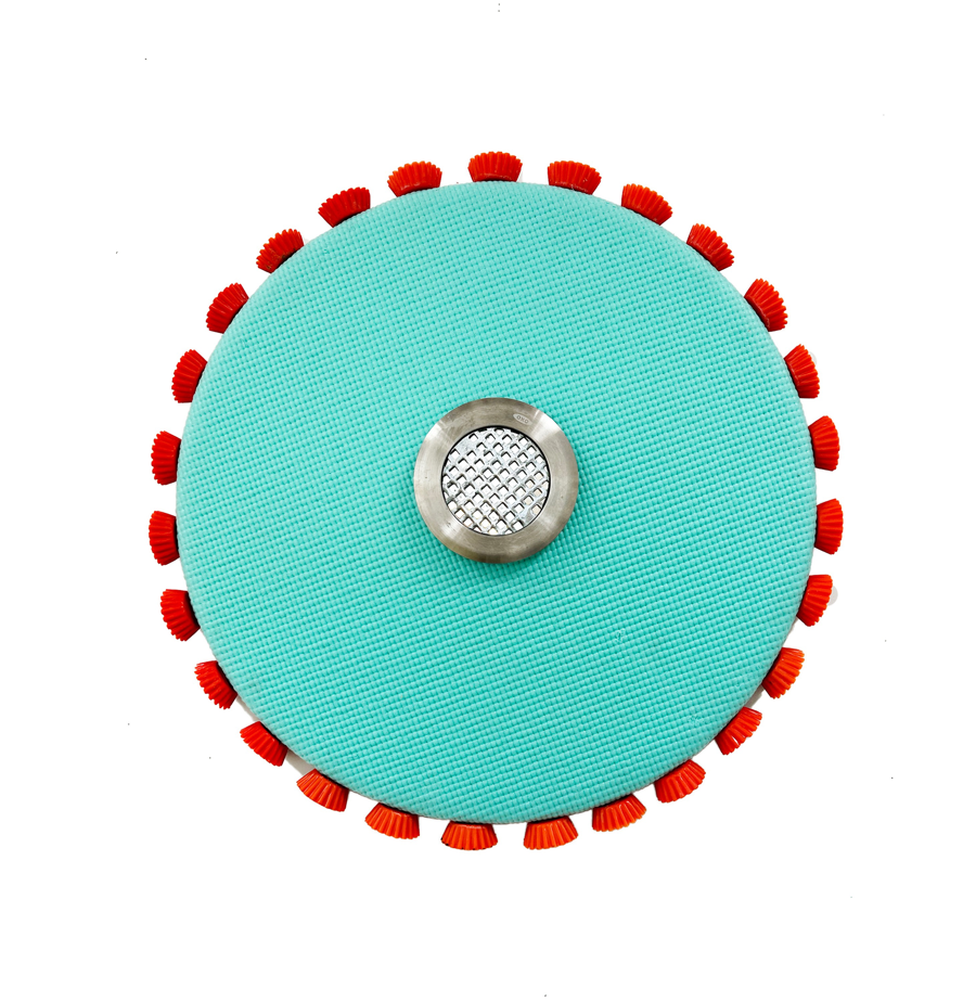 Bonnie Rychlak, "New Users" Yoga mat, metal, mirror, and cast wax 22 x 3 inches Artist Bio: I am an artist, sometimes a curator, and a writer. As a practicing artist, I have presented my work in solo and numerous group exhibitions in the U.S. and Japan. I graduated with a Bachelor of Arts degree from the University of California at Los Angeles and a Master of Fine Arts degree from the University of Massachusetts at Amherst. I have received numerous grants and residencies. As a curator and museum consultant, I have organized numerous modern and contemporary art exhibitions, including those for ArtHelix in Bushwick, New York; LongHouse Reserve in East Hampton; the Bogart Salon in Bushwick, New York; and in Orange County, California. I am the former curator for and studio assistant to Isamu Noguchi, having curated numerous exhibitions for his museum and foundation. Artist Statement: I have stretched a yoga mat over a circular stretcher for New Uses. This modern material references a ubiquitous new age activity as it incorporates elements of urban mechanicals. The drain motif signifies the action of evacuation, of siphoning off, while the mirror makes the viewer the subject in this activity, in a polarity of concepts.