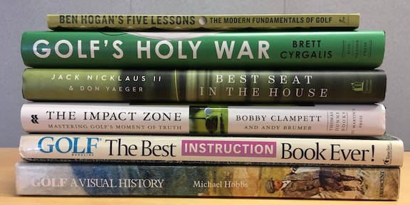 Up Your Game: Six volumes on golf Ben Hogan’s Five Lessons (Ben Hogan) Golf’s Holy War (Bret Cyrgalis) Best Seat in the House (Jack Nicklaus) The Impact Zone (Bobby Clampett) GOLF The Best Instruction Book Ever GOLF A Visual History (Michael Hobbs)