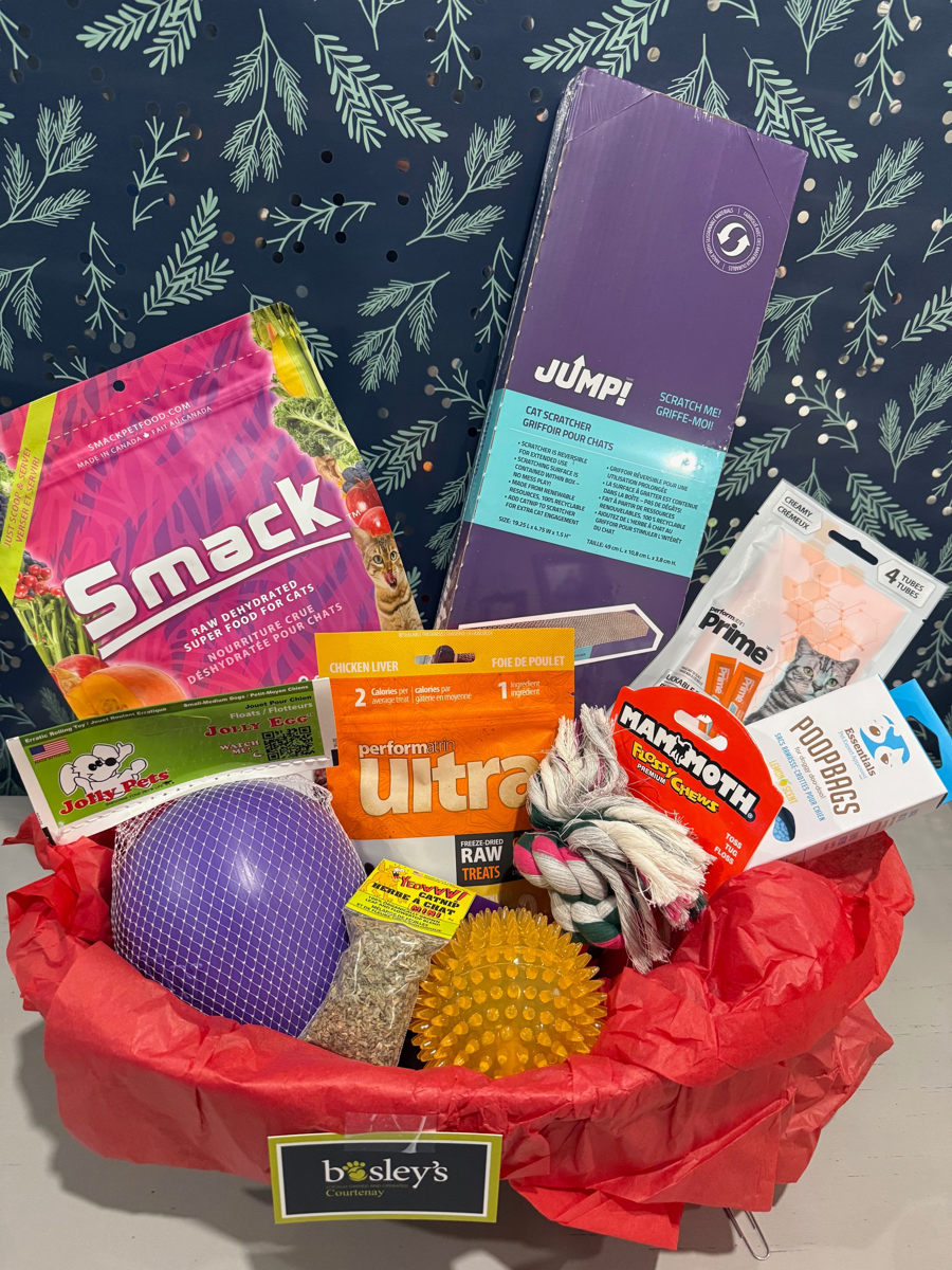 Full of toys and teats, a perfect basket for any cat and dog owner. Donated by Bosley's Courtenay