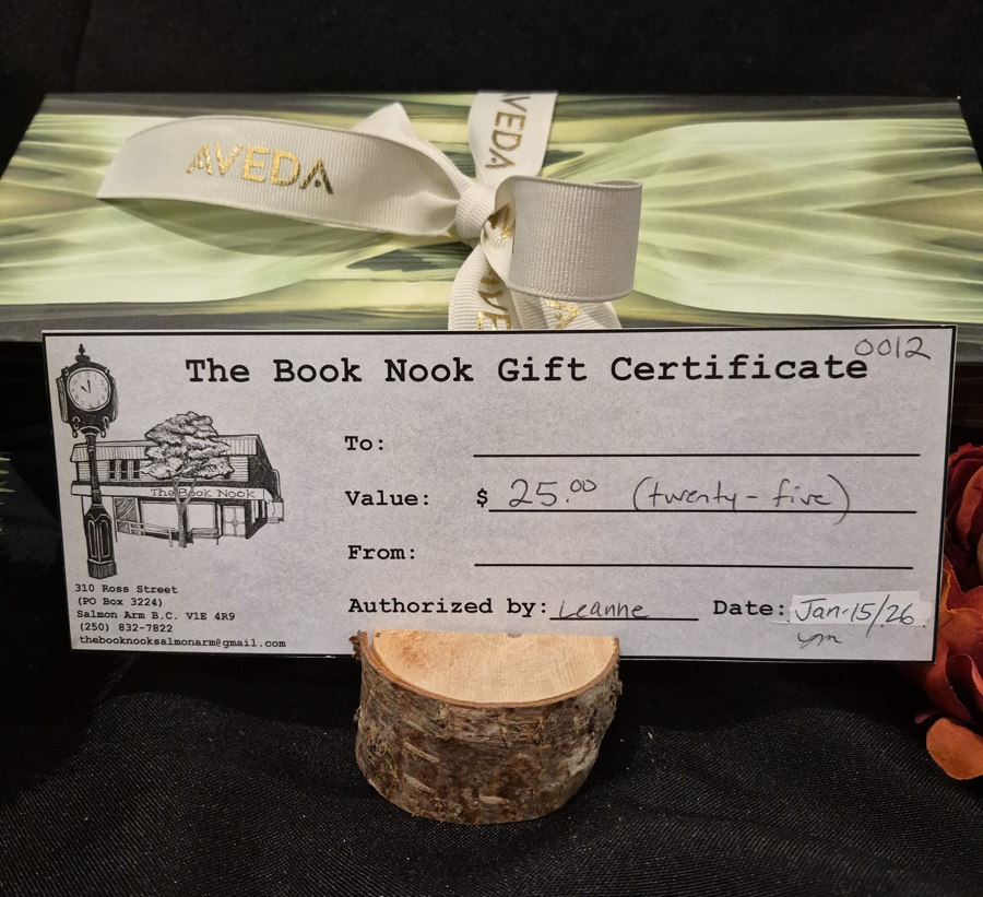 A $25.00 gift certificate from the Book Nook for your favorite stories & more, with an Aveda Tea Set & beauty samples. The Tea gift box includes a ceramic cup, loose-leaf mint/citrus tea, and a scoop spoon. Beauty care items are 25 ml hand repair cream, a sampler of botanical strengthening repair shampoo & conditioner and an Advanced Botanical Kinetics cleansing mouse sample. This is a perfect combo to curl up with a hot cuppa and a good story!