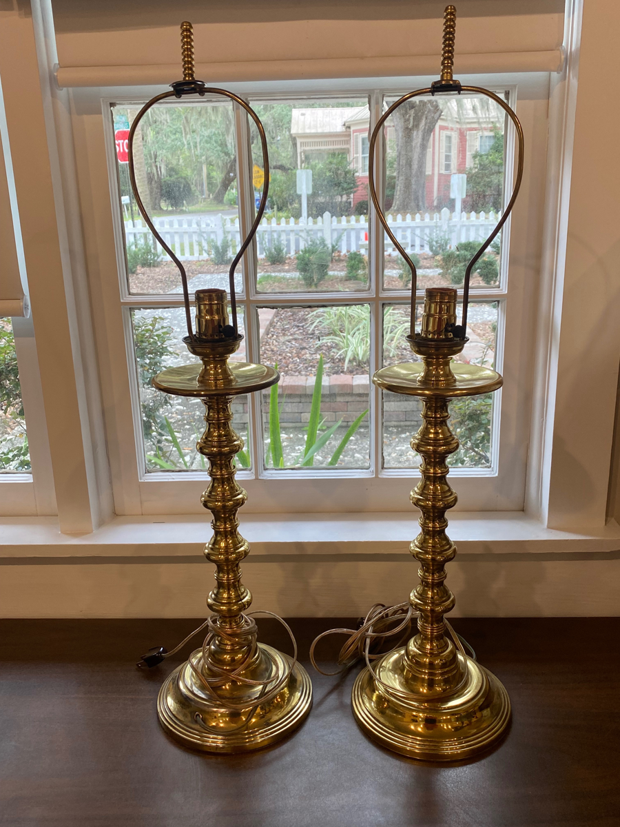 Introducing a stunning pair of Brass Candlestick Lamps that will elevate your home decor. Standing at 20 inches tall (not including the harp), these lamps are a perfect blend of vintage charm and modern durability. Crafted in the 1930s, they are made from heavy, high-quality brass that ensures both stability and elegance. Each lamp has been meticulously buffed and sprayed for longevity, preserving their beautiful finish while providing a lasting addition to your space. Illuminate your rooms with these exquisite brass candlestick lamps, perfect for adding a touch of classic sophistication to any setting.