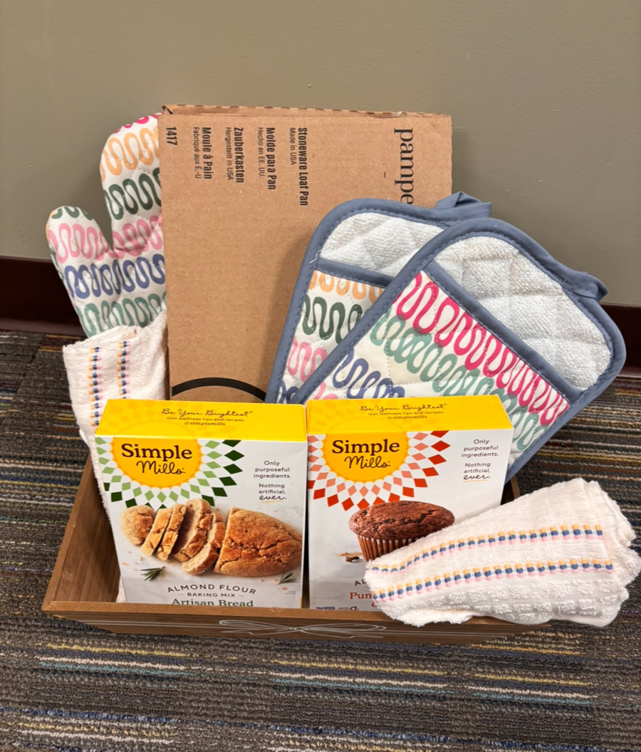 Enjoy this amazing Pampered chef loaf pan, bread mix, potholders and kitchen towels!