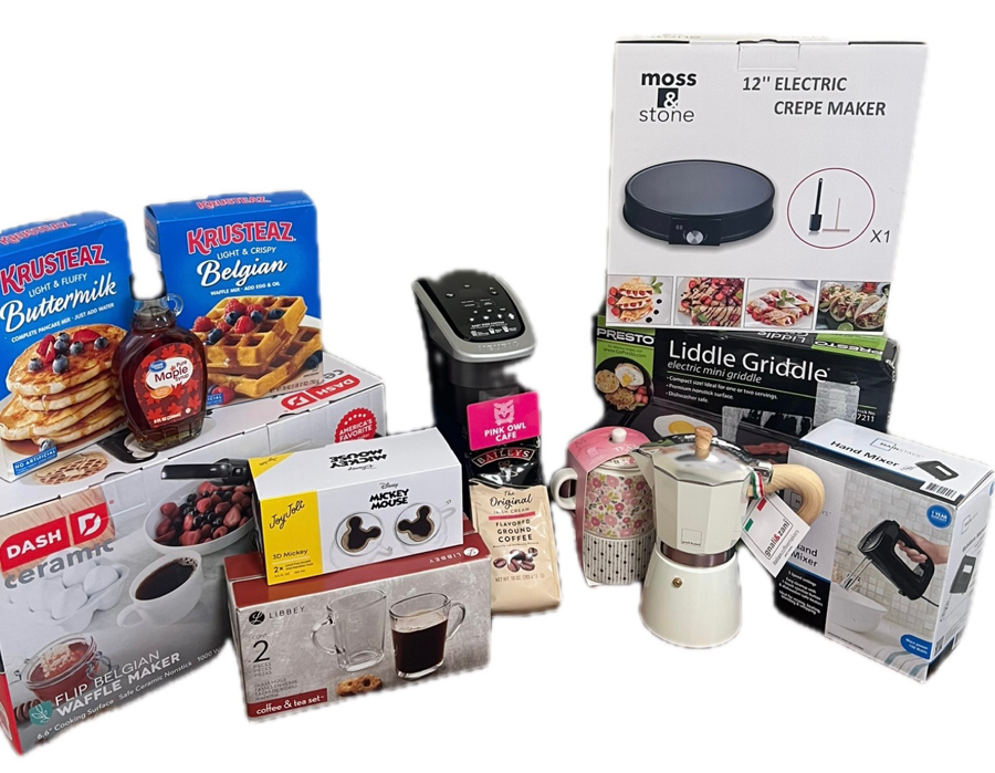 Start your mornings off right with this Breakfast Bliss basket — a cozy and delicious way to elevate your breakfast routine! Enjoy fluffy waffles and pancakes made to perfection with the included griddle, waffle maker, and hand mixer. Sip your favorite brew from the Pink Owl Coffee Shop with a $30 gift card, or create your own café experience at home using the Keurig coffee maker, stovetop espresso maker, and premium coffee beans. Complete with charming coffee mugs and teacups, this basket is everything you need to turn any morning into a relaxing, café-style treat!